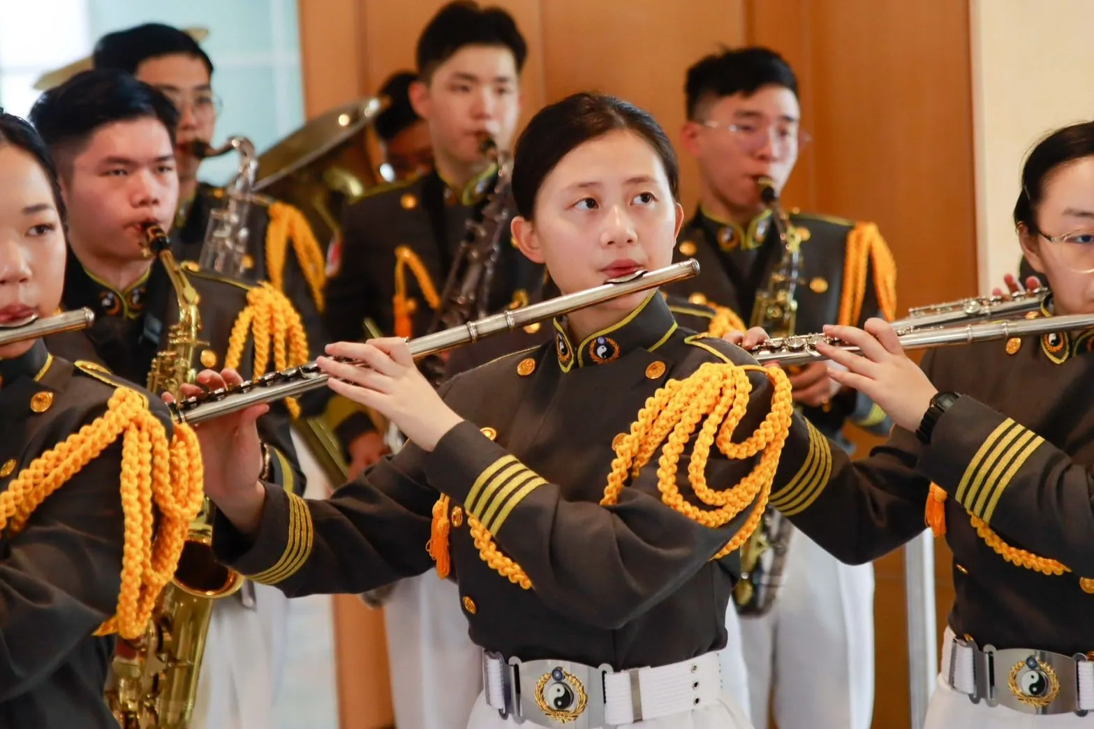復興崗軍樂隊在119週年校慶系列活動中再度展現精湛的演奏技巧,本次校慶音樂會特別由政戰學院、管理學院及理工學院共襄盛舉,三院菁英齊聚率真校區,以悠揚樂音進行交流切磋。音樂會曲目多元豐富,從優雅的古典樂到現代流行樂曲,展現了國防學子的多元才華,壓軸曲目由三院共同演出的《Pirates of the Caribbean 神鬼奇航》更是高潮迭起,政戰學院軍樂隊的優美樂聲,配合理工學院、管理學院學生的精彩演奏,呈現出前所未有的磅礴氣勢,贏得全場熱烈掌聲。本次活動不僅展現了學生們的音樂才華,更促進了三院間的深厚情誼,為國防大學119週年校慶增添璀璨色彩。